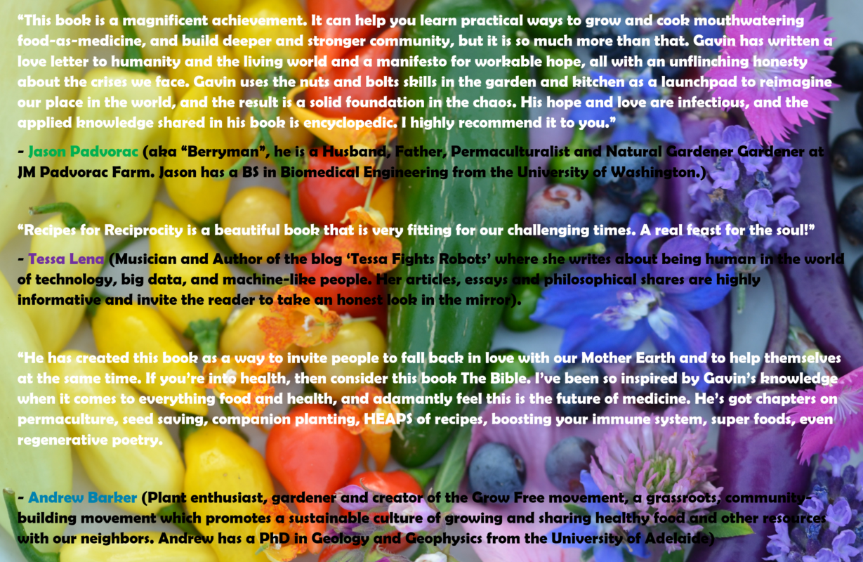 “Recipes for Reciprocity ” is much more than a cook book. Gavin lays the foundation for holistic living, then provides road maps from seed, to exquisite meals, and back to seed. The reader gains not only the “how’s” of soul nourishing food, but also the “why’s”. From novice to expert, everyone benefits from reading this book.” – Charles Tatch